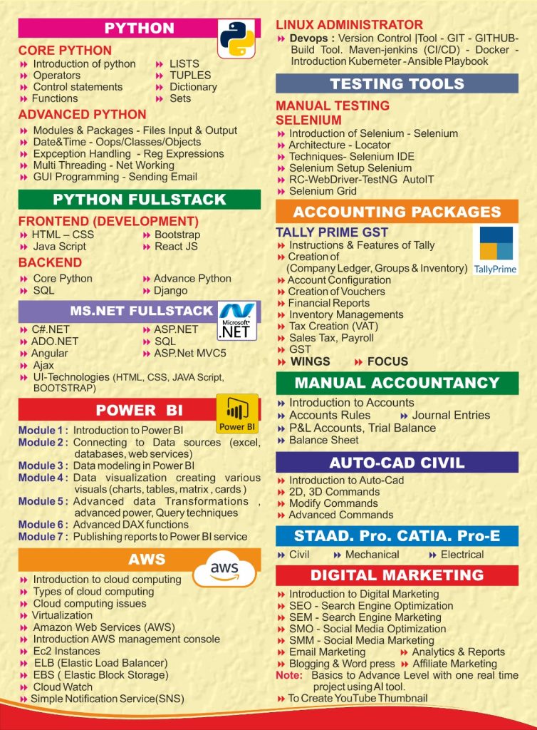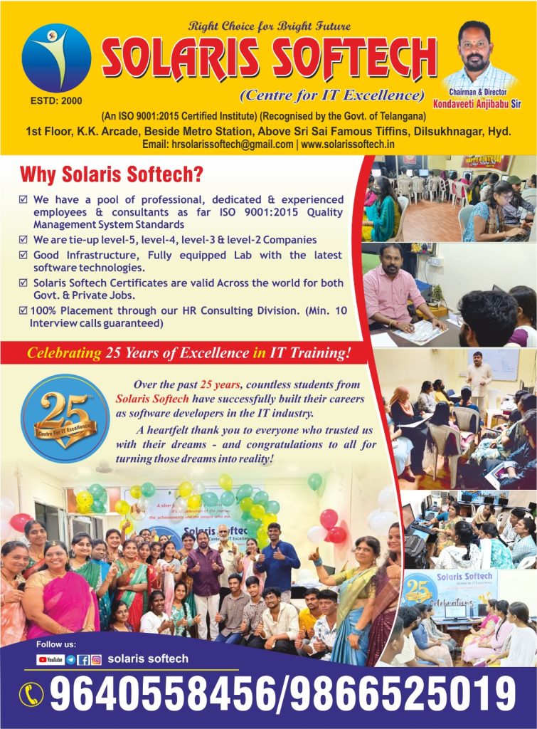 Solaris Softech is a leading IT training institute offering a wide range of job-oriented and industry-focused courses designed to help students, job seekers, and working professionals build successful careers in the IT sector. Recognized as one of the best IT training institutes in Hyderabad, Solaris Softech provides expert-led training with real-time projects, practical learning, and placement assistance. The institute offers in-demand courses including Full Stack Development (Java, Python, MERN, .NET), Core and Advanced Java, Python Programming, Web Development (HTML, CSS, JavaScript, React, PHP), Data Science, Data Analytics, Power BI, Tableau, Advanced Excel, Artificial Intelligence (AI), Machine Learning (ML), Prompt Engineering, ChatGPT and AI tools training, SAP modules like SAP FICO, SAP MM, SAP SD, SAP ABAP, SAP HCM, Digital Marketing (SEO, Google Ads, Social Media Marketing, Content Marketing, Affiliate Marketing), Cloud Computing courses such as AWS, Azure, DevOps, Linux Administration, and business-related courses like Tally with GST, MIS Reporting, and HR Analytics. With experienced trainers, flexible online and offline classes, affordable fees, certification support, and dedicated placement training, Solaris Softech stands out as the top choice for those searching for the best IT courses in Hyderabad, job-oriented IT training, full stack developer courses, data science training, SAP certification, digital marketing courses, and cloud computing programs. Enroll today at Solaris Softech to gain industry-relevant skills and secure high-paying IT jobs with confidence.